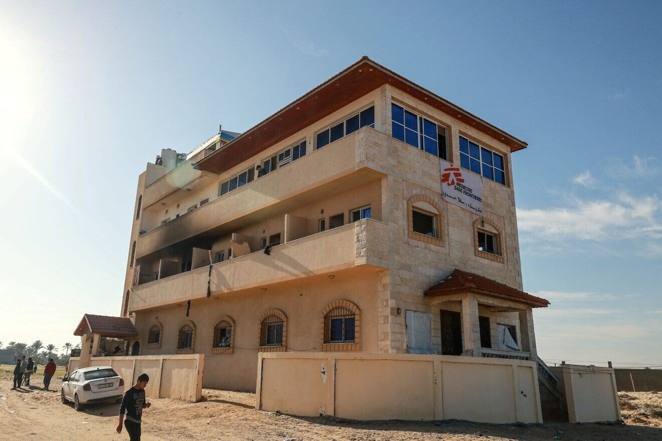 A Doctors Without Borders (MSF) building in the al-Mawasi area, west of Khan Yuni, in the southern Gaza Strip, on Feb. 21, 2024. Photo by MOHAMMED ABED/AFP via Getty Images.
